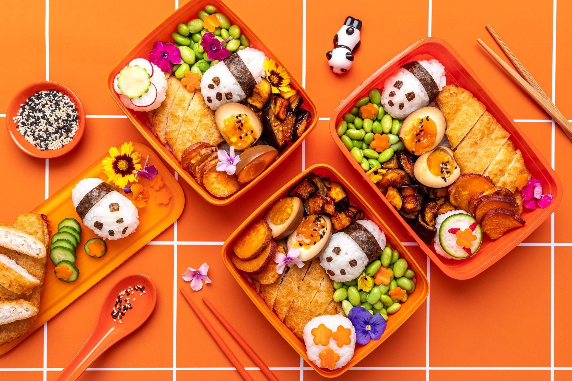 Assemble the bento boxes as artistically as possible. Add a sliced Crisp & Chunky Tempura hake fillet to each lunchbox, as well as a sushi panda, rice ball and Soy-marinated egg (cut in half). Portion out the sweet potato, aubergine and edamame in sections. Add decorative cucumber and carrot elements, and then sprinkle with sesame seeds and garnish with edible flowers, if using.
