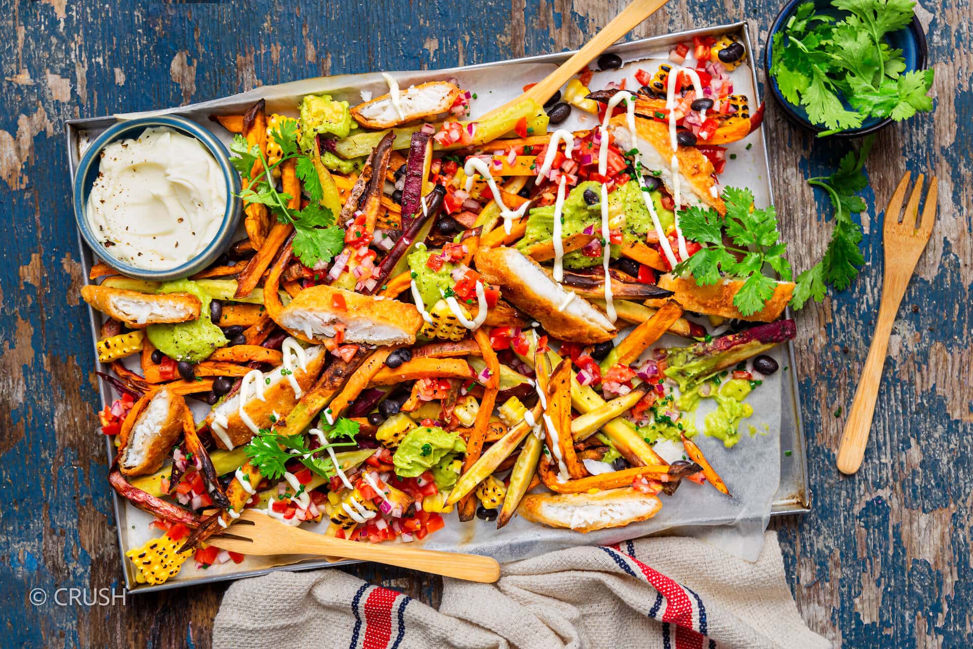 Add dollops of guacamole to the pile of fries. Add black beans, charred corn and spoonfuls of tomato and onion salsa. Drizzle sour cream over the top and garnish with chopped chives and coriander. Add any remaining sour cream or guacamole to bowls for dipping and serve.