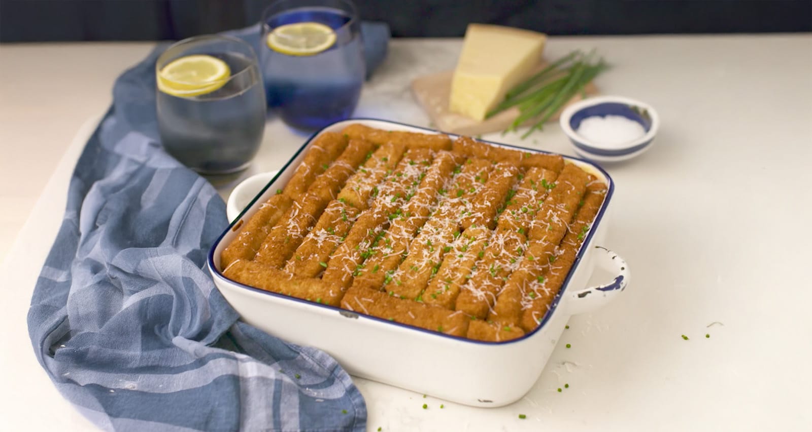 Cheese Sauce Melt the butter in a medium-size saucepan over medium heat. Add the flour and whisk to combine and create a roux. Add the milk a little at a time, whisking and fully incorporating after each addition. Cook the roux while stirring constantly for 4-5 minutes until it is blonde in colour and smells nutty. Remove the roux from the stove and add the cheese to the pot. Let the cheese settle in the hot roux for a minute to start melting then whisk to combine. Macaroni & Topping Preheat the oven to 200 Β°C. Add a pot of salted water to the stove and bring up to a boil. Add the dried macaroni. Boil the macaroni for 2 minutes less than the recommended cooking time on the packaging, as the pasta will finish cooking in the oven as it bakes. Drain the pasta reserving 1 cup (250 ml) of the pasta water. Add the pasta to the cheese sauce and mix to combine. Add a little of the pasta water to thin the sauce to the desired consistency. Add more if necessary. Transfer the macaroni to an oven dish and sprinkle a handful of grated cheese on top. Lay the frozen fish fingers evenly on the top of the macaroni and pop it into the oven. Bake for 20 minutes until the fish fingers are golden and crunchy. Remove the dish from the oven and top with grated Parmesan and chopped chives and serve.